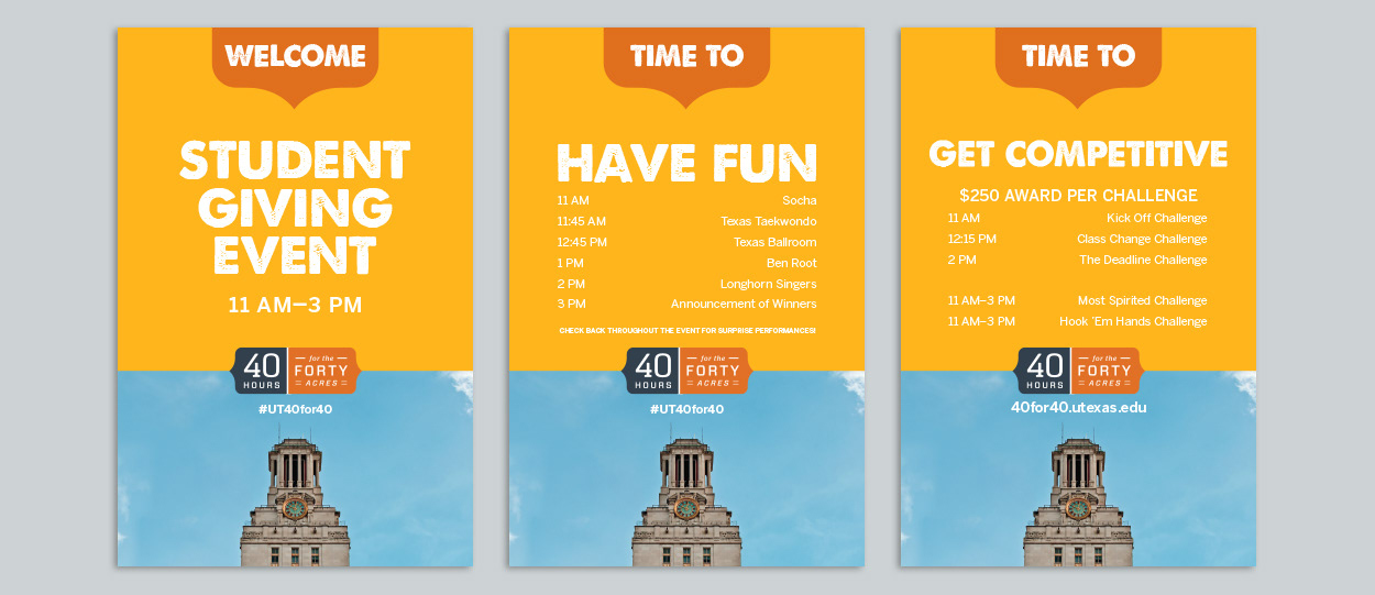 A significant day of giving organized by The University of Texas at Austin, aimed at supporting various individuals, locations, and initiatives throughout the campus. This event inspires alumni, parents, students, faculty, staff, and friends to contribute to the university. A range of promotional materials was created for the occasion, including pins, posters, event signage, social media content, direct mail and advertising.